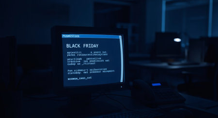 Old computer monitor displaying Black Friday text in a dark office. Concept of online cyber sale and holiday shopping event.