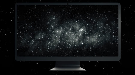 A modern computer monitor displays a captivating digital network visualization, illustrating complex connections and data flow within a dark workspace environment.