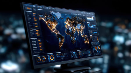 Modern data dashboard showcasing global statistics, interactive charts, and visualizations for business intelligence in a contemporary workspace, enhancing decision-making.
