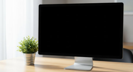 A sleek, modern computer monitor sits on a wooden desk, complemented by a small potted plant, in a brightly lit room.
