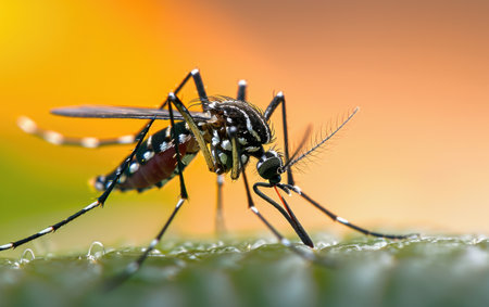 Close up of an asian tiger mosquito sucking blood from human skin, highlighting the risk of mosquito borne diseases and the importance of mosquito control