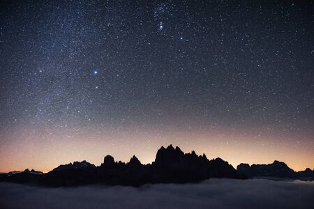 Picturesque view of night sky with beautiful stars over foggy hill
