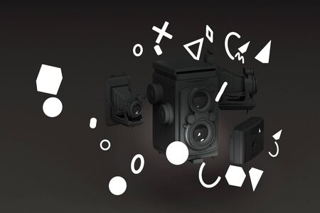 Black vintage camera surrounding by memphis pattern light on a black background.