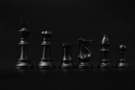 White and black chess pieces are placed on the board, ready for war. The game of chess is an analogy to world politics.