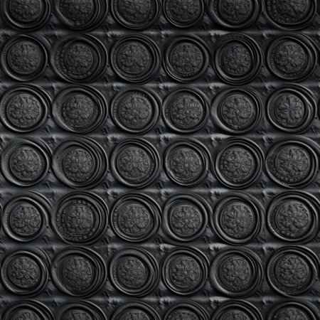 A monochromatic composition of rectangular frames with intricate geometric patterns arranged in a precise grid on a black wall