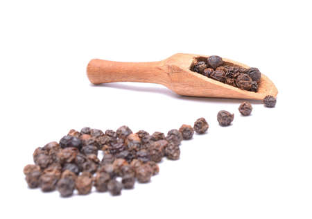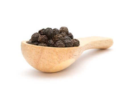 Black pepper in a wooden spoon isolated