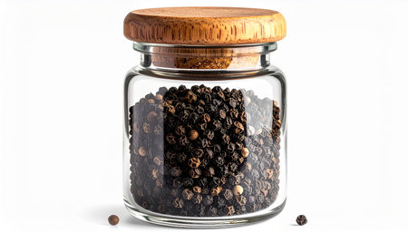 Culinary showing glass jar filled with whole black peppercorns and a wooden cork lid on white background keywords: black pepper, peppercorns, spice,...