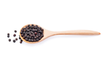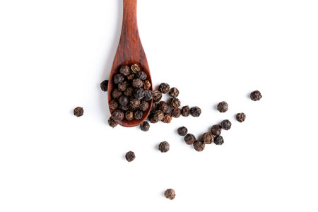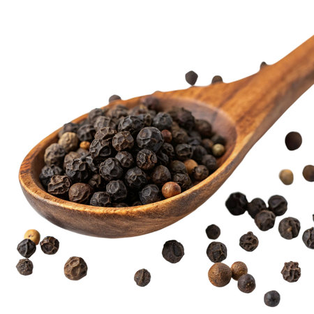 A collection of whole black peppercorns presented in a wooden spoon against a clean white background. Perfect for culinary use, this image highlights the rich texture and appearance of black pepper as a staple spice in cooking. Ideal for food blogs, recipe books, and culinary-themed projects.