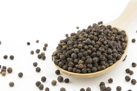 Black pepper or black peppercorns seeds in wooden spoon isolated on white background