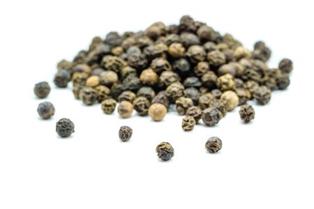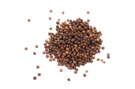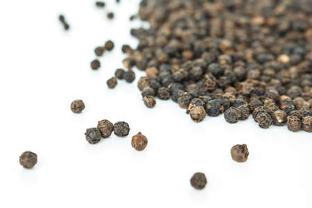 black peppercorns heap on white background.