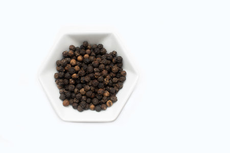 minimalist concept of natural black pepper spice on white hexagon-shaped plate
