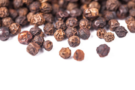 closeup dried black pepper on white background , selective focus