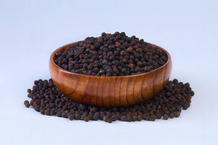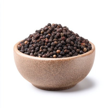 This image features a rustic bowl filled with black peppercorns against a clean white background, ideal for culinary projects and cooking inspiration.