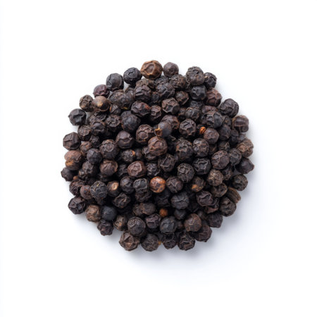 A vibrant pile of whole black peppercorns showcases an essential spice for cooking. Perfect for enhancing flavors in various dishes, this image captures the essence of culinary creativity. Ideal for food blogs, cookbooks, and recipe websites.