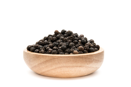 Black pepper in wooden bowl on white background