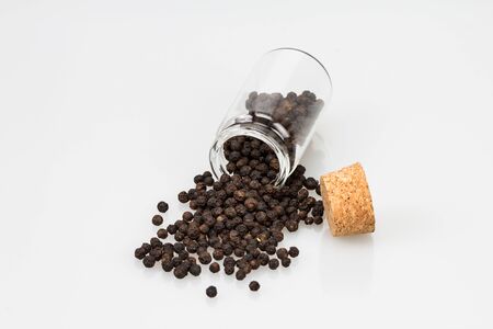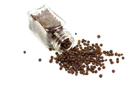 Black pepper in glass bottle isolated on white background. Black pepper is a spicy seasoning and herb for healthy.