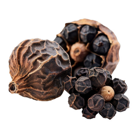 An intricate cluster of dried black peppercorns reveals their rugged surfaces and deep, warm hues, highlighting their essential role in flavoring dishes.