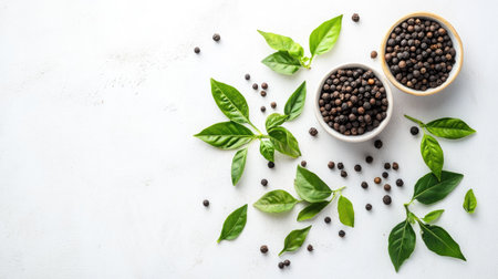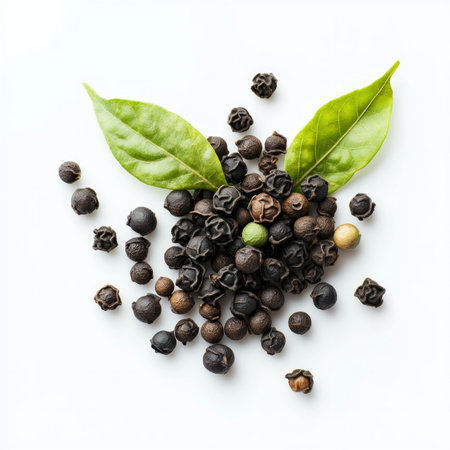A scattered arrangement of black peppercorns with vibrant green leaves on a white background, highlighting their natural and aromatic qualities in culinary uses.