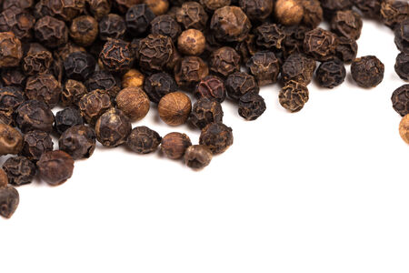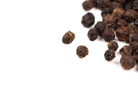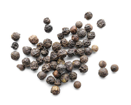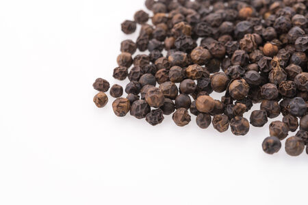 Black pepper corns on white background