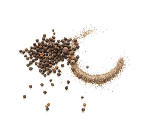 Black peppercorns and powder on white background