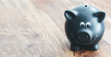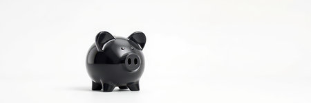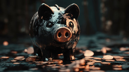 A glossy black piggy bank sits among scattered coins, symbolizing savings and financial stability. Ideal for concepts related to finance and wealth management.