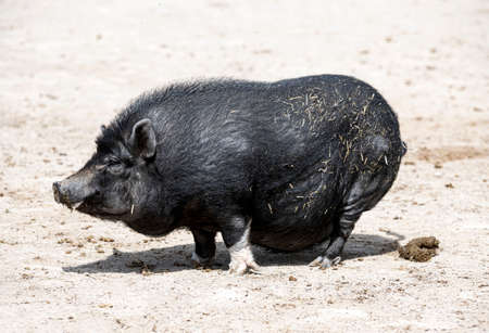 black, Vietnamese Pot-bellied defecate on the sand