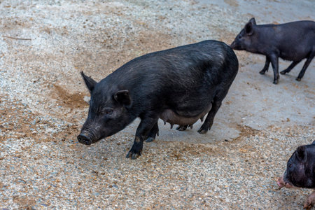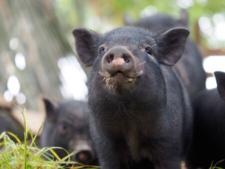 Black Vietnamese pig on the farm yard. Animal life, people and d
