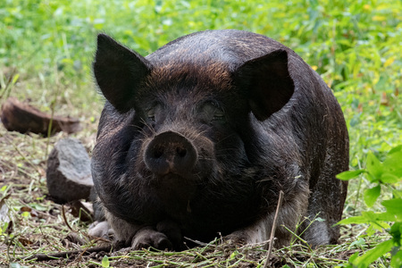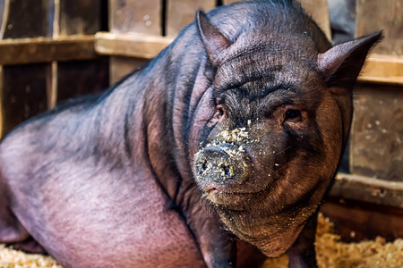 Big Vietnamese black pig portrait outside on the farm.