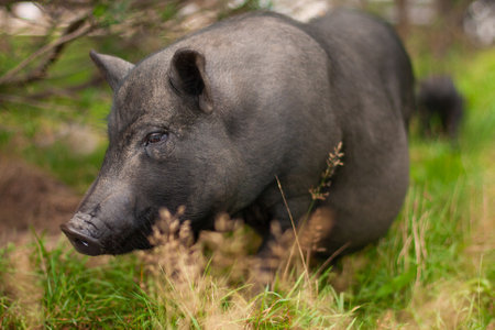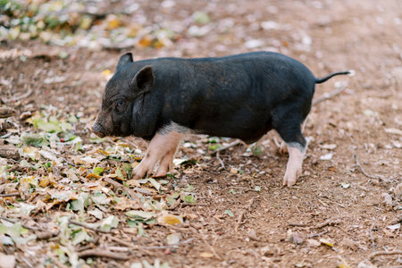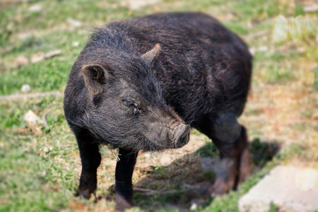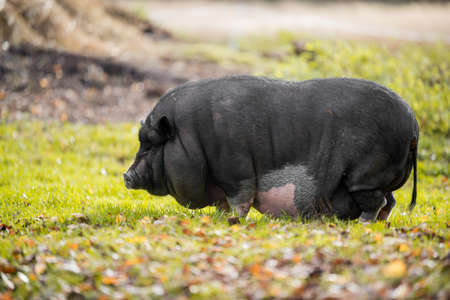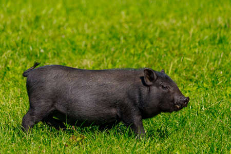 Black mini pig. Domestic pig on a walk. Agriculture