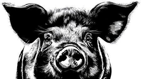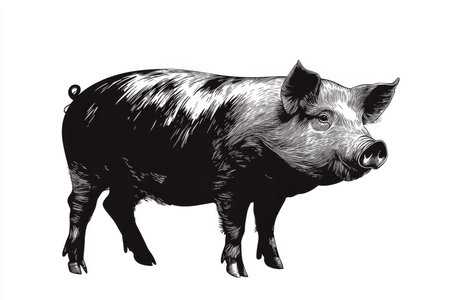 Illustration captures a pig in a natural pose, highlighting its round body, curly tail, and distinctive facial features. The black and white design emphasizes its texture and form.