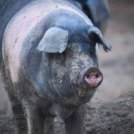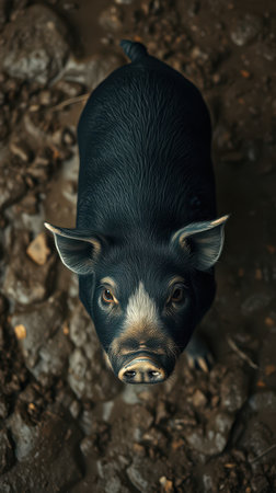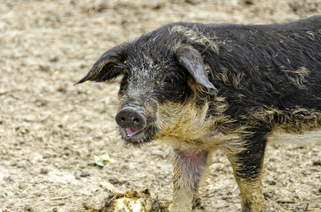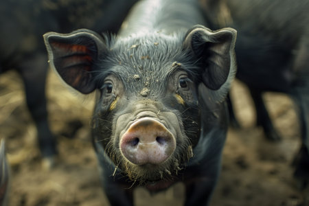 Portrait of a black pig in a muddy paddock on a farm