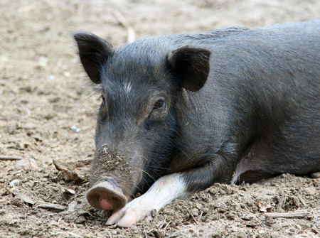 A funny little boar resting on the ground