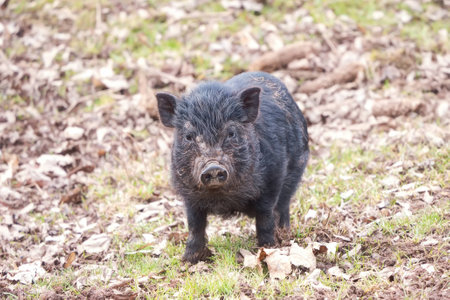 Little black piglet in the paddock. Wild boar.