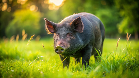 Candid Photo: Black Pig Grazing in Lush Green Grass