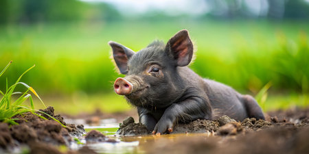 Adorable Black Piglet Playing in Muddy Farm Field - Rural Idyll Stock Photo