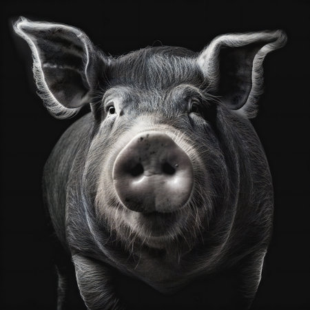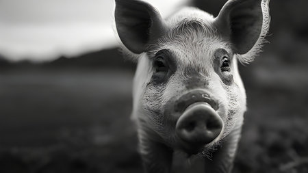 A striking black and white portrait of a piglet, capturing its cute snout and expressive eyes in a close up view of the farm animal's face.