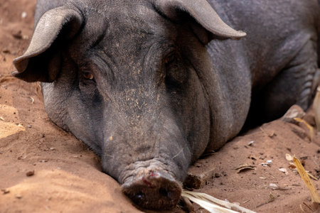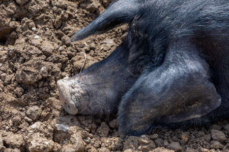 Portrait of a black pig on a farm, close-up