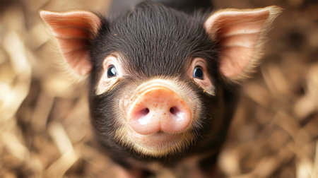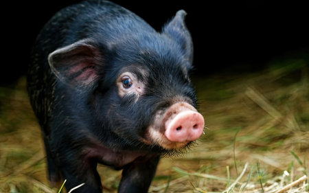 Close-up of a black piglet eating hay in a farm, with a curious and adorable expression