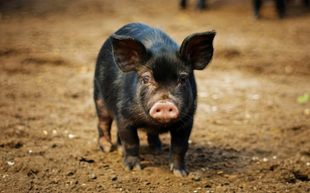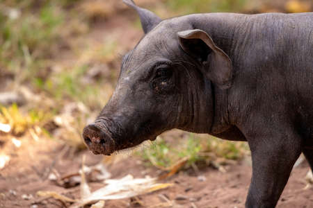 A young piglet with dark color fur in a farmland