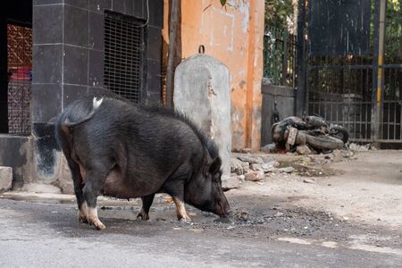 Big boar drinks water from a dirty puddle on a street in New Delhi