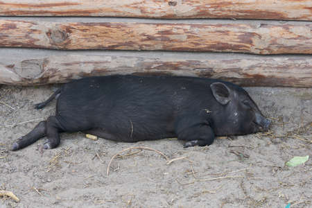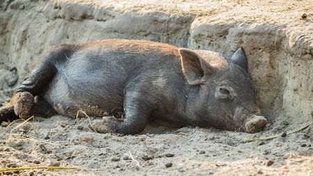 domestic asian black piglett is happy sleeping on the ground
