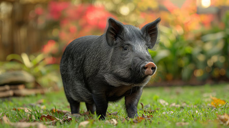 A charming Vietnamese Pot-belly pig stands amidst lush greenery, displaying its sleek black coat and curious expression.