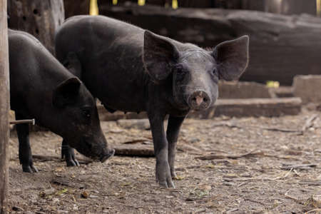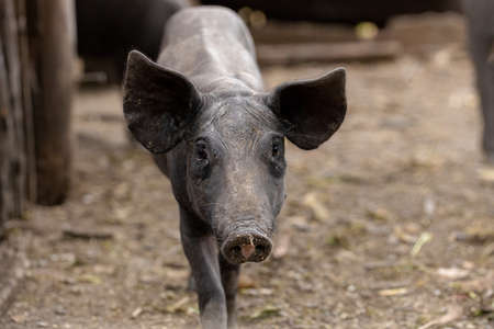 Black pig bred in farm sty with selective focus