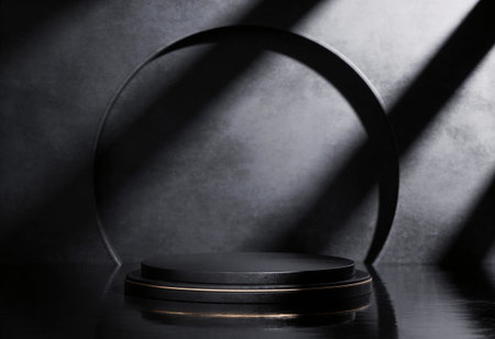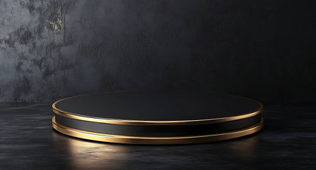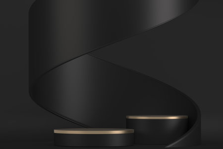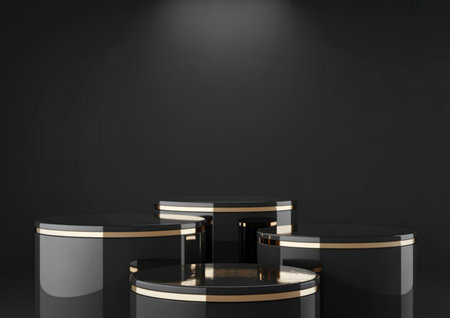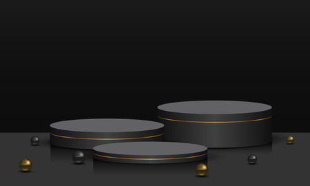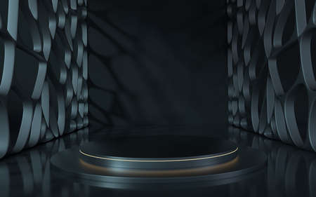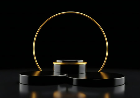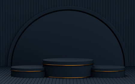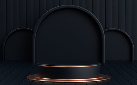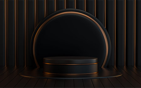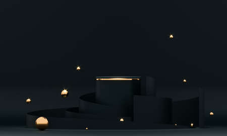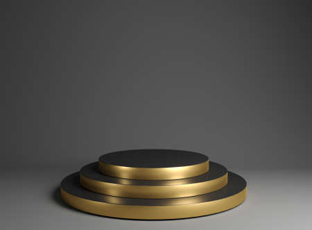 3D rendering black podium geometry with gold elements. Product presentation blank podium. Minimal scene round step floor abstract composition. Empty showcase, pedestal platform display.