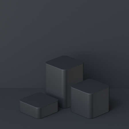 Cosmetic display product stand. Five black blocks on dark background. 3D rendering illustration