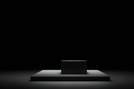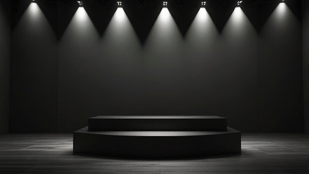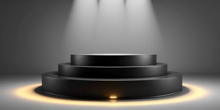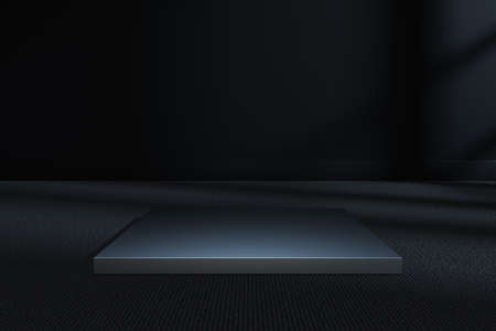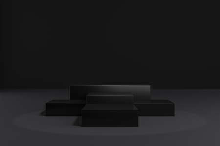 Black podium in dark room with spotlights. 3D rendering.