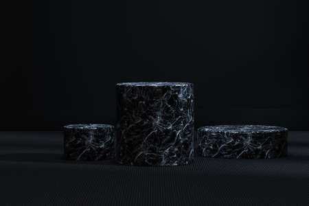 Three empty Rough black stands and abstract white geometry background. Podium, pedestal, platform for cosmetic product presentation, showcase. Minimalist mock up scene, concept template. 3d rendering