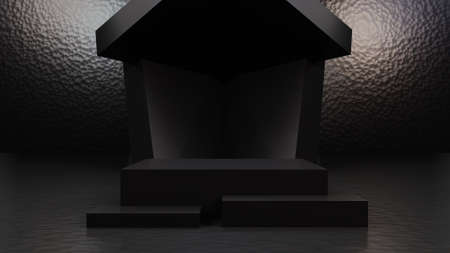 Black podium on black background, 3d render, mockup.