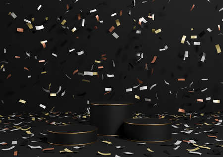 Black and gold podiums on black background. 3D rendering.