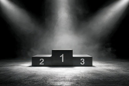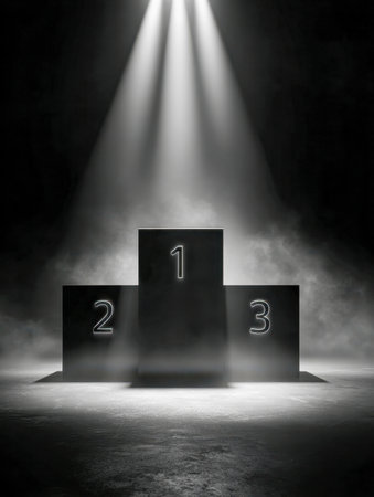 A sleek, dark platform showcases glowing numerals against a misty backdrop, with intense lighting creating a powerful atmosphere of triumph and success.